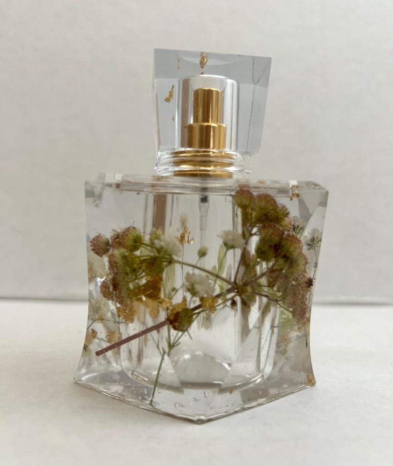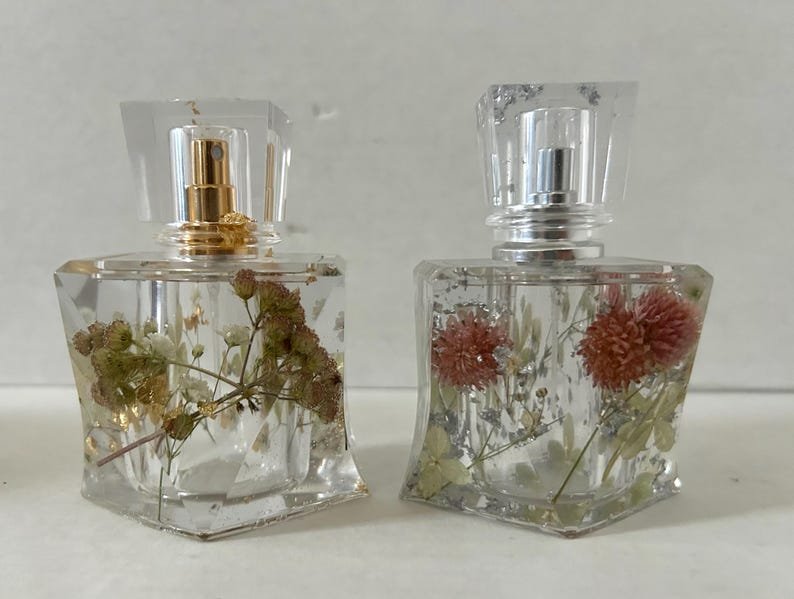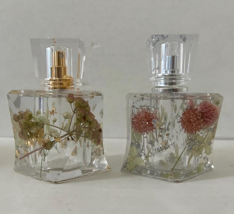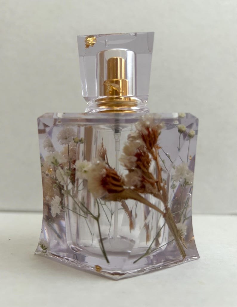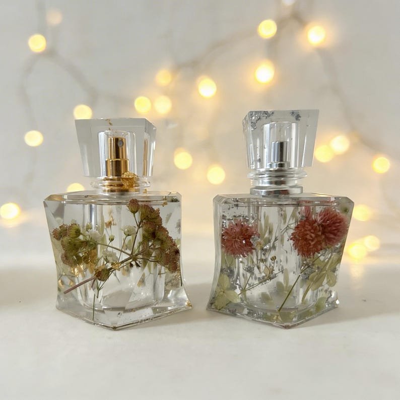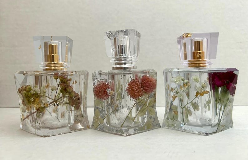 Add a touch of luxury and nature to your perfume collection with these handmade perfume bottles, made from high-quality epoxy resin and decorated with real dried flowers and real gold/silver leaves. Each piece is carefully crafted by hand, making each bottle truly unique.