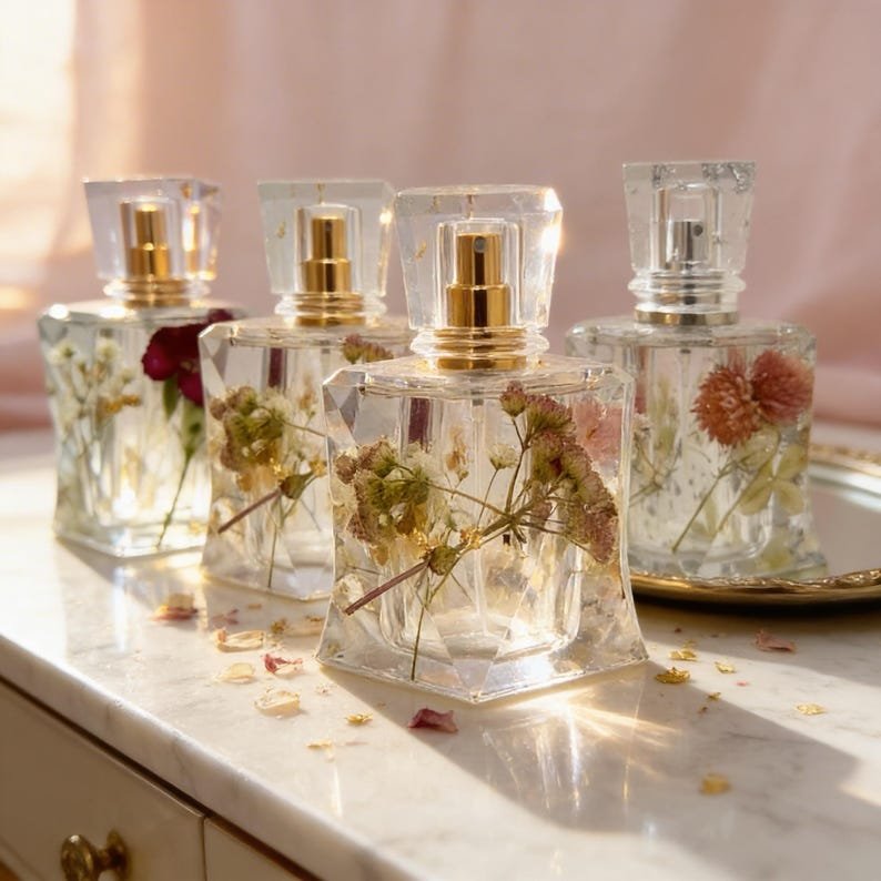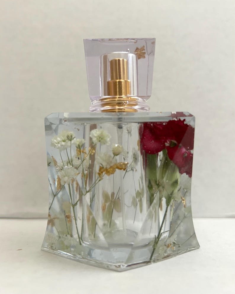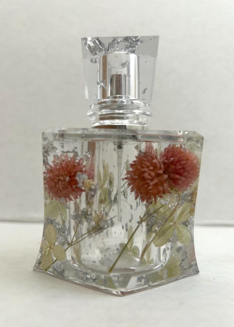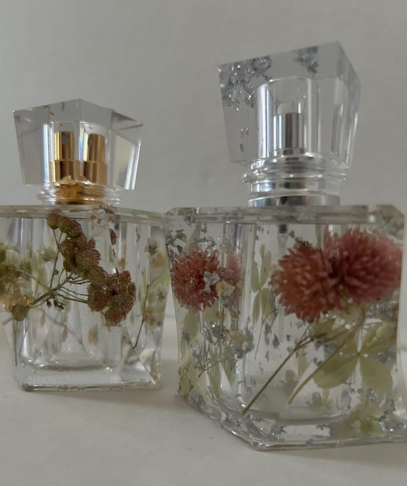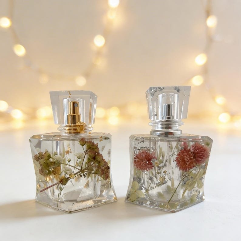 Add a touch of luxury and nature to your perfume collection with these handmade perfume bottles, made from high-quality epoxy resin and decorated with real dried flowers and real gold/silver leaves. Each piece is carefully crafted by hand, making each bottle truly unique.