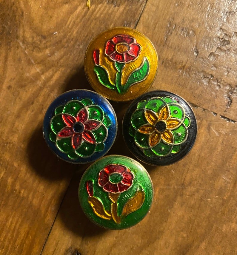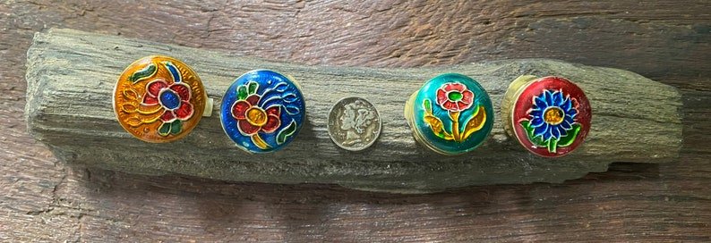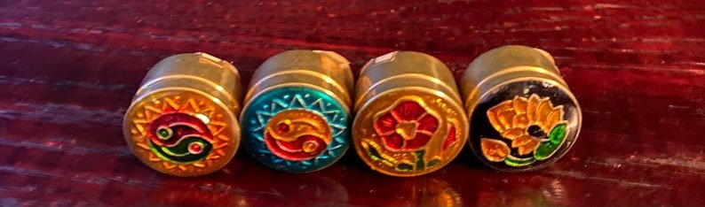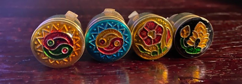 Lightly scented solid perfume made from pure essential oils, beeswax, and woods + resin infused oil blends, in lovely tiny, sample brass containers featuring press-on lids.